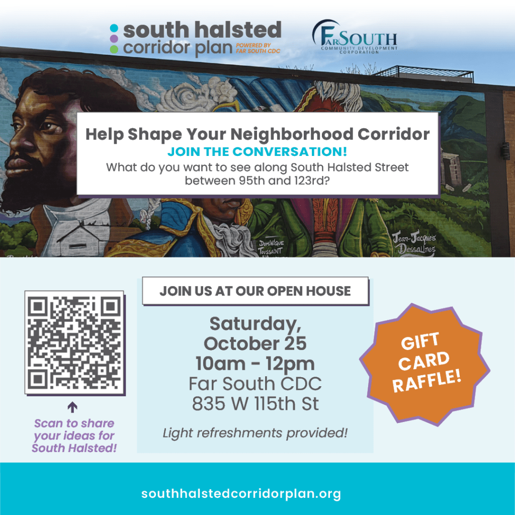 Stop by for an Open House style community workshop at Far South CDC’s headquarters at 835 W 115th Street. Grab a snack, learn more about the project, connect with neighbors, and share your vision for the future of South Halsted Street!