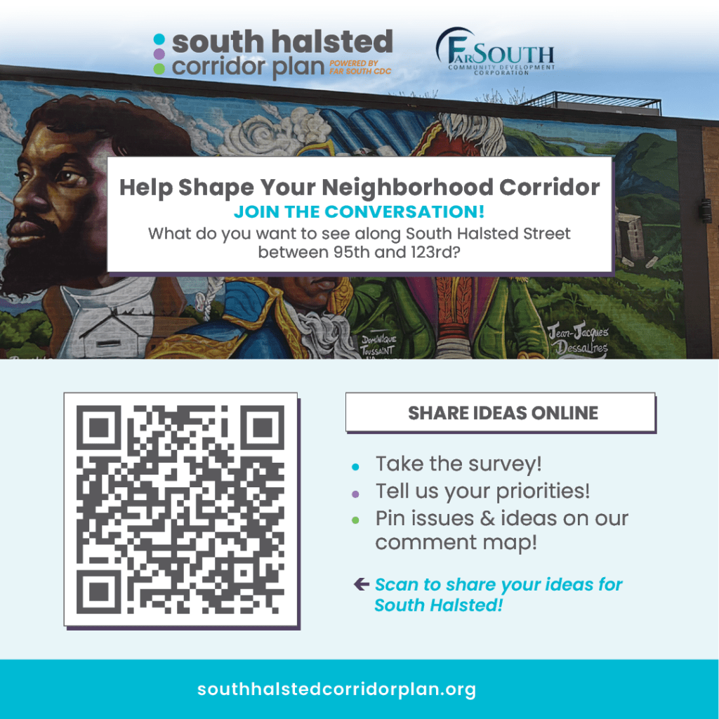 Thank you for staying engaged in shaping the future of the South Halsted Corridor. We hope you’ll join us, invite others, and share the Eventbrite link! Food will be provided, and attendees can enter a raffle for a $50 gift card to a local restaurant.